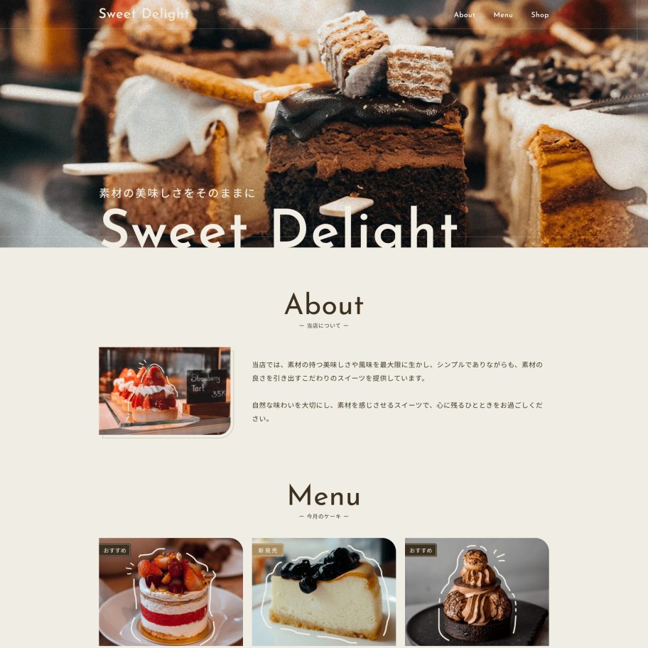 オンラインスクールの課題として、スイートショップ「Sweet Delight」のサイトを実装しました。 提供されたデザインデータをもとに、HTML・CSS・JavaScript を使用して再現しました。